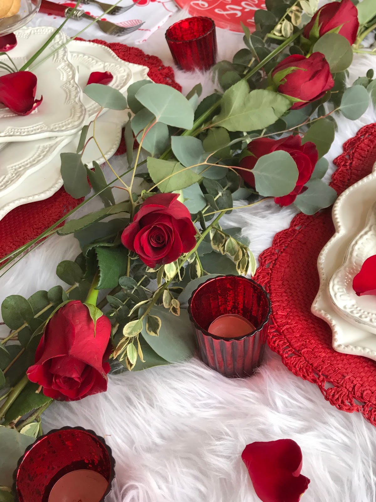 What a nice surprise for your hubby, Jacqueline! And so sweet he bought you roses early after watching a romantic movie together! I love the fur heart pillows and table cover. With your red goblets, flatware and roses it looks great on the white fluffy fur. Your plate stack is pretty and it is a nice effect how you placed the last plate on an angle.